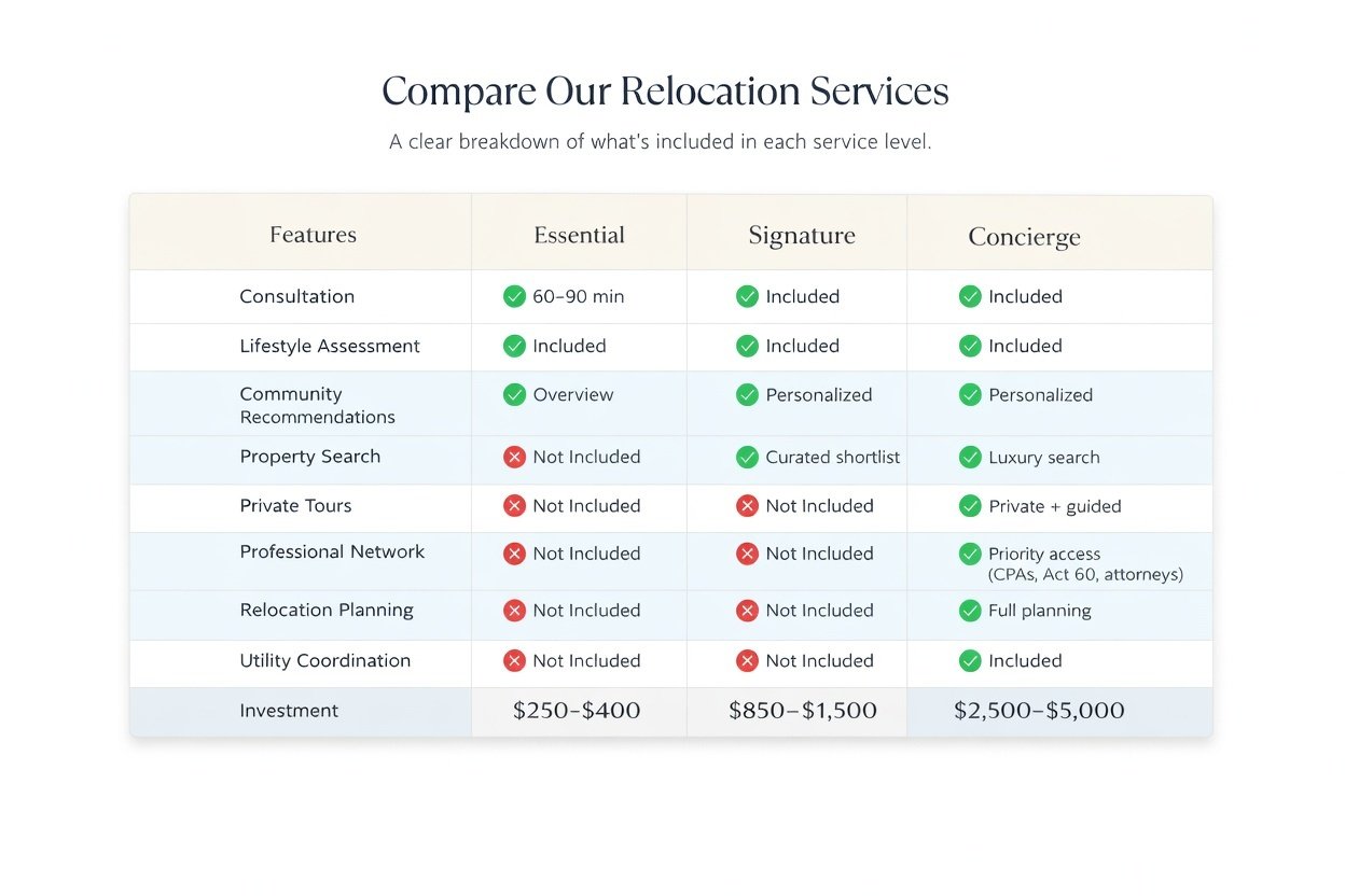 At Amadeus Luxury Properties, we provide personalized relocation guidance to help you navigate every step of your move to Puerto Rico. From exploring neighborhoods to coordinating trusted professionals, our team ensures a seamless transition to your new home. Relocation advisory services are distinct from real estate brokerage services and are offered as an additional service for clients seeking a more comprehensive and concierge-level relocation experience.